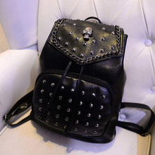 Hot 2015 New Arrival Chain Rivet Skull Design PU Leather Backpack Preppy Style School Bag Black Backpack Leather Travel Bag Mochila Limited supply