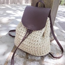 Create 2016 Summer Crochet Straw Bag Backpack Vines Beach Bag Women Drawstring Bags Sackpack with Leather Cover Hollow Out Purchase